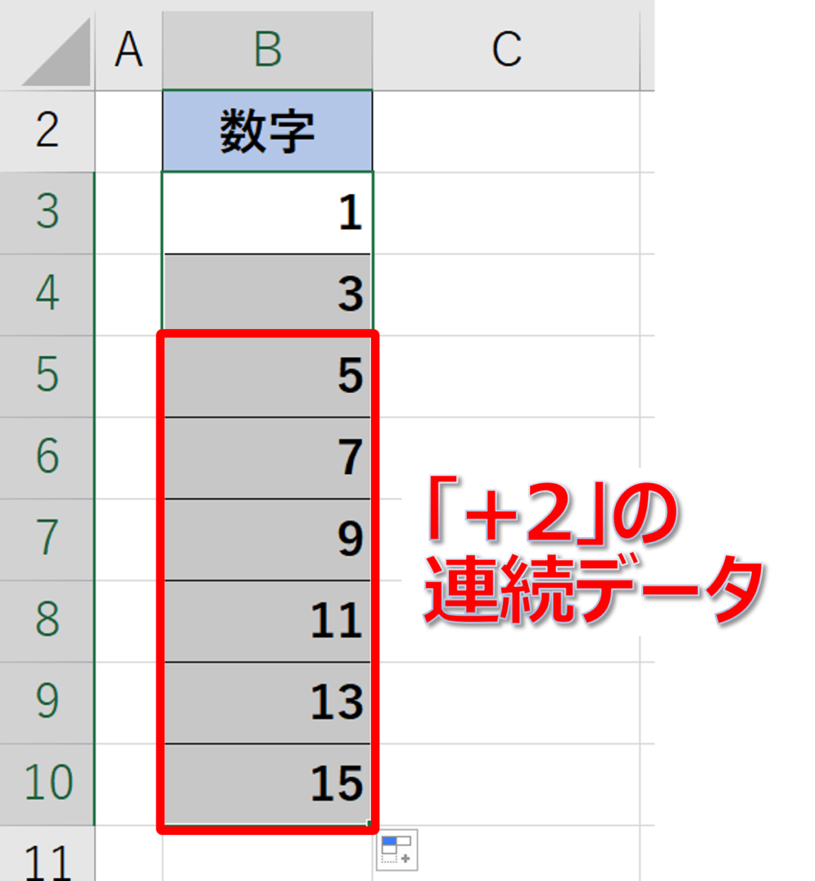 そうすると、選択した「1」と「3」という値を参考に、上のセルを「+2」した「5」「7」「9」「11」「13」「15」を連続した値としてセルを埋めることが出来ます。