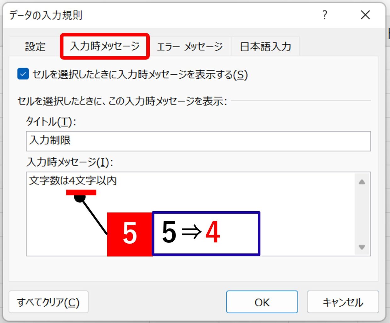 設定する場合は、「入力時メッセージ」タブを選択し、表示させたいタイトルとメッセージを設定します。