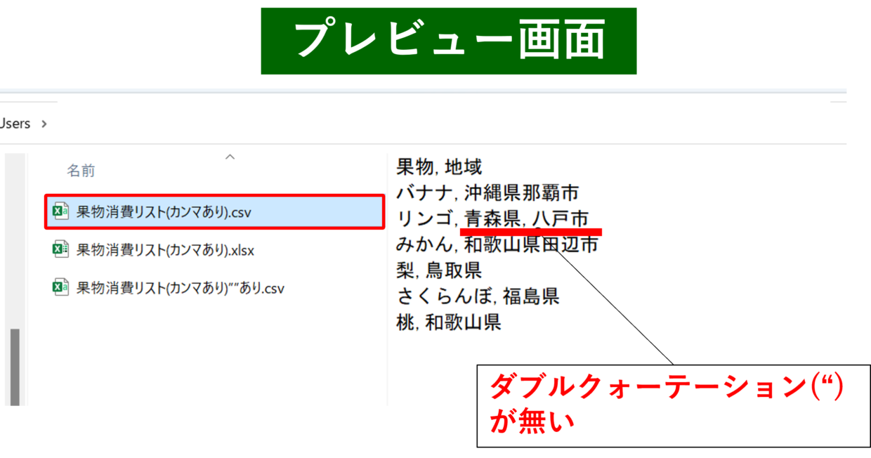 このExcelファイルをCSVファイルに変換して、エクスプローラーのプレビュー画面で確認すると、「”青森県,八戸市”」とダブルクォーテーション(”)で文字が囲まれます。