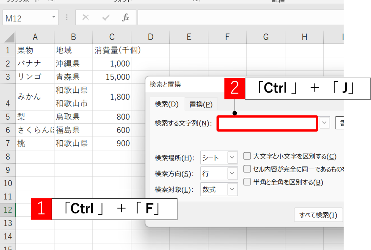 画面左上の「全セル選択」ボタンをクリックして(図①)、「Ctrl」キー+「H」キーのショートカットキーで「検索と置換」画面の「置換」タブを表示させます。