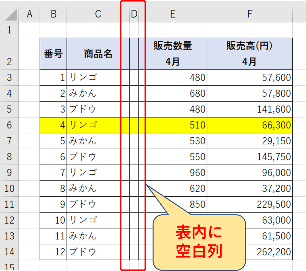 下の図のように、表の中のD列に表を左右に分断する空白列があります。黄色の行は表の崩れを説明するために色塗りしています。