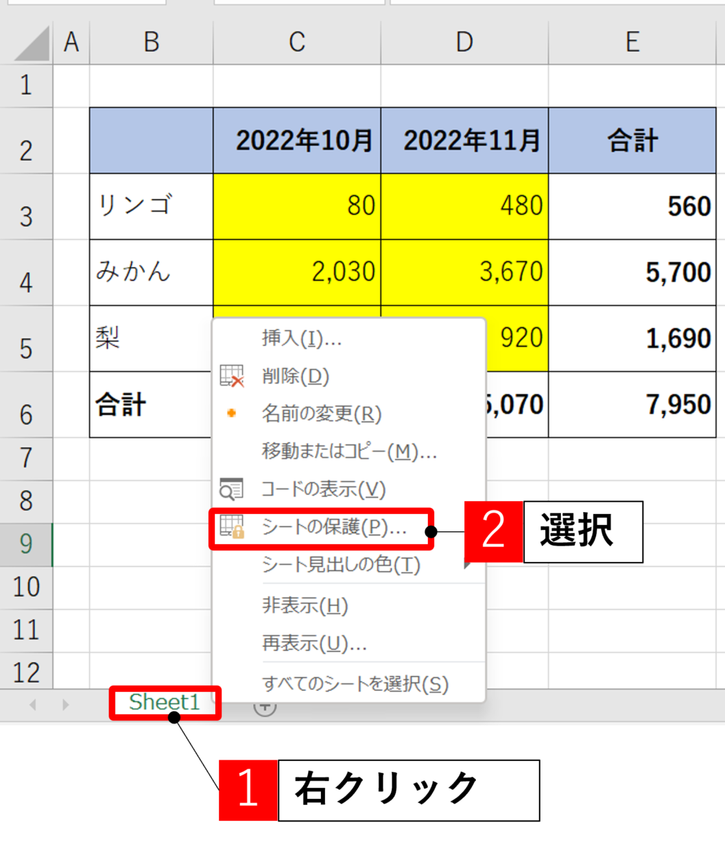 ワークシートを右クリックして、右クリックメニューの「シートの保護」を選択します。