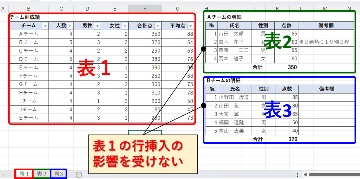 そうすることで、左側の表1に行挿入したり行削除しても、右側に貼り付けた図には影響を与えません。