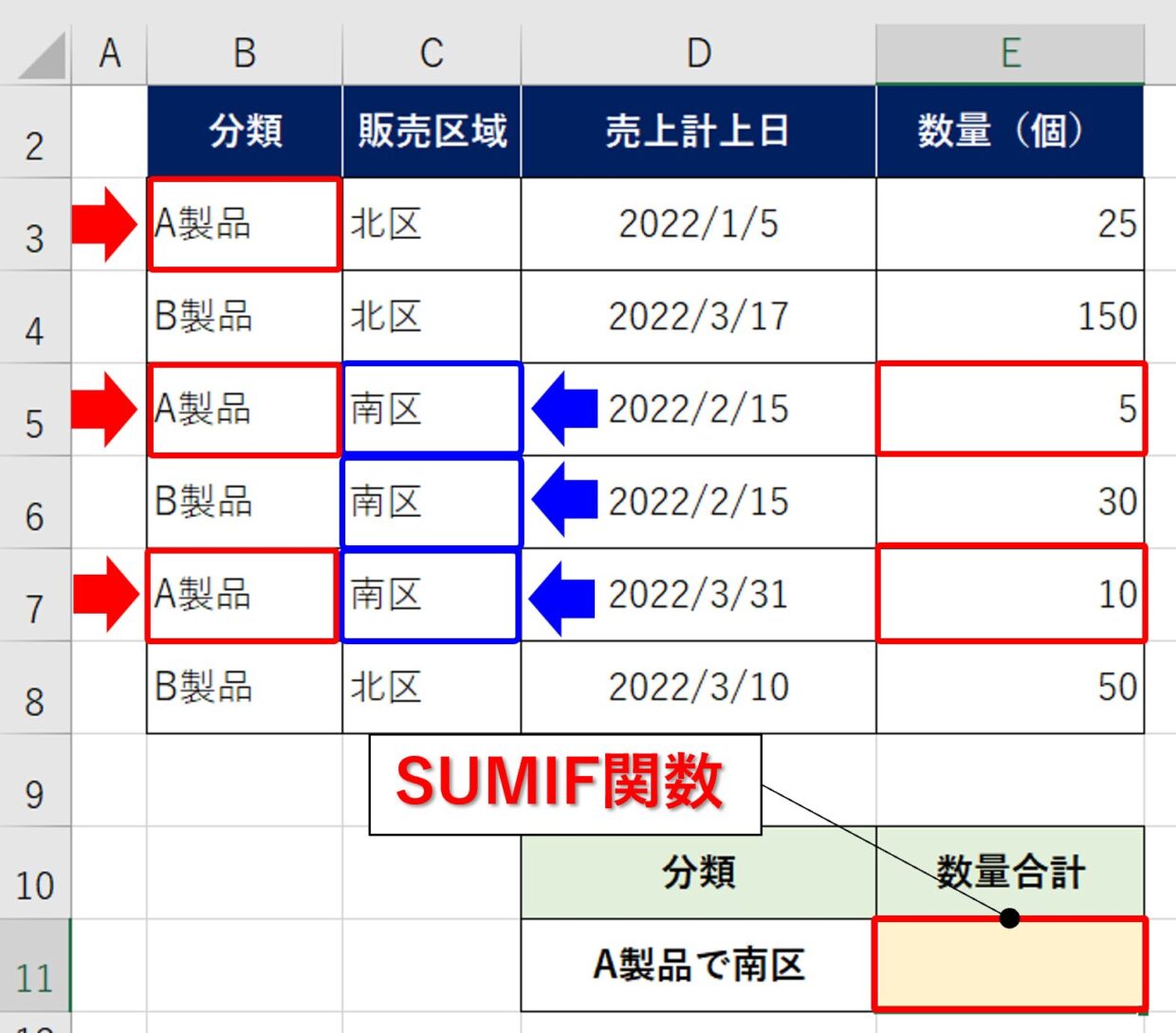 仮に、SUMIF関数で「A製品」を合計しても「南区」以外の数量も混ざってしまいます。
