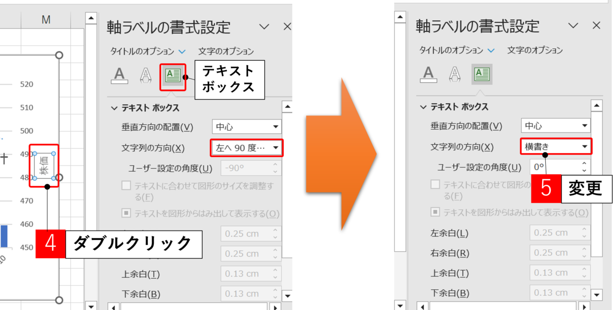 ラベルを横書きに変更したい場合は、ラベルをダブルクリックします。次に、「軸ラベルの書式設定」画面の「テキストボックス」メニューから「文字列の方向」を「横書き」に変更します。