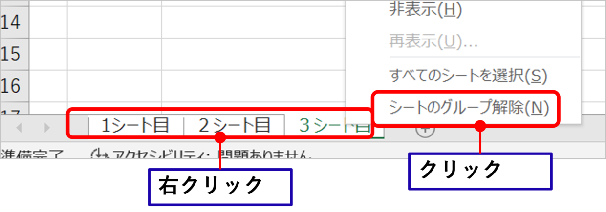 手順2で全シートをグループ指定したため、どれかのシートを右クリックし、[シートのグループ解除]ボタンをクリックします。