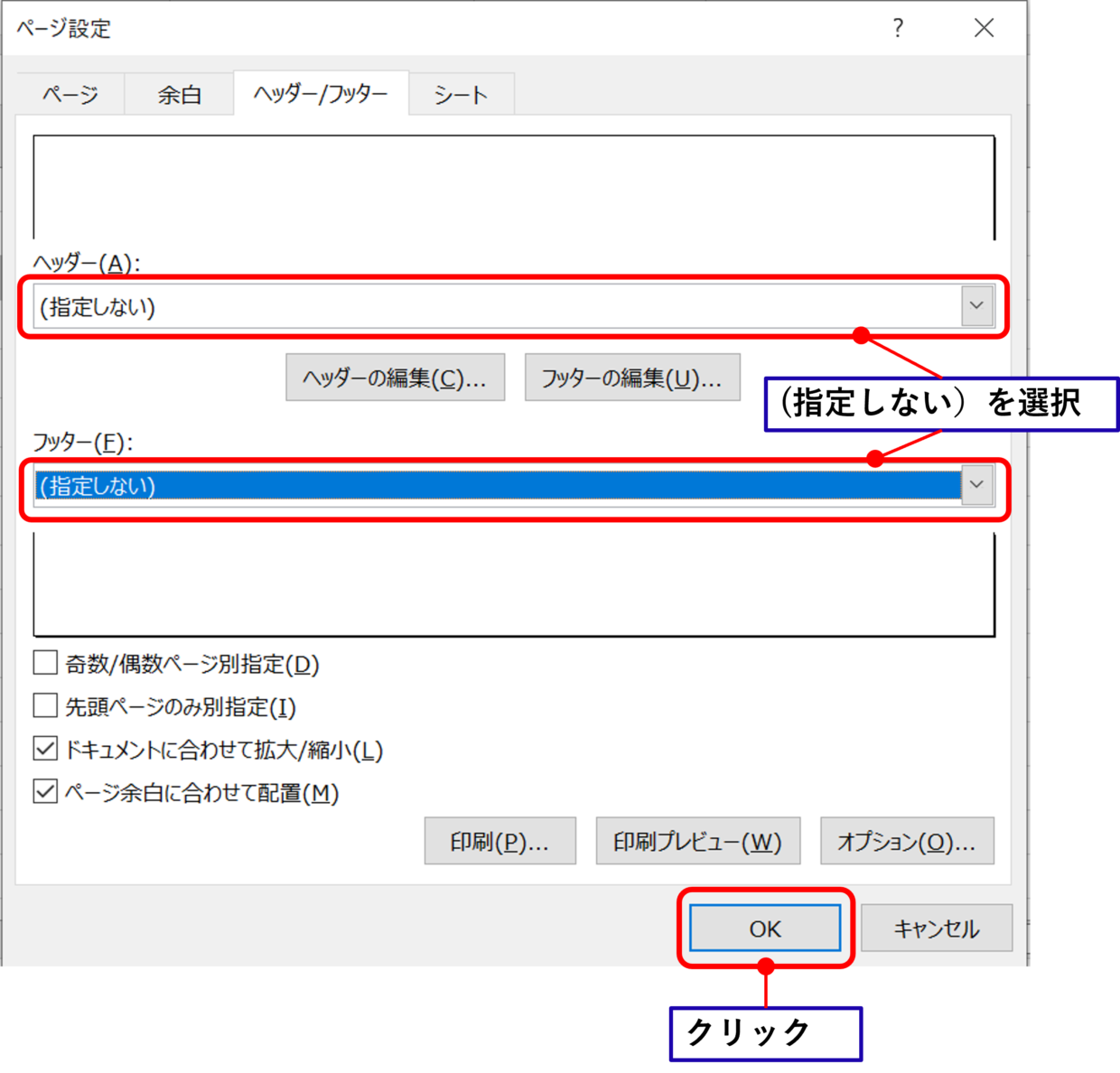 手順5.「ヘッダー」と「フッター」欄をそれぞれ「(指定しない)」を選択し、「OK」ボタンをクリックします。