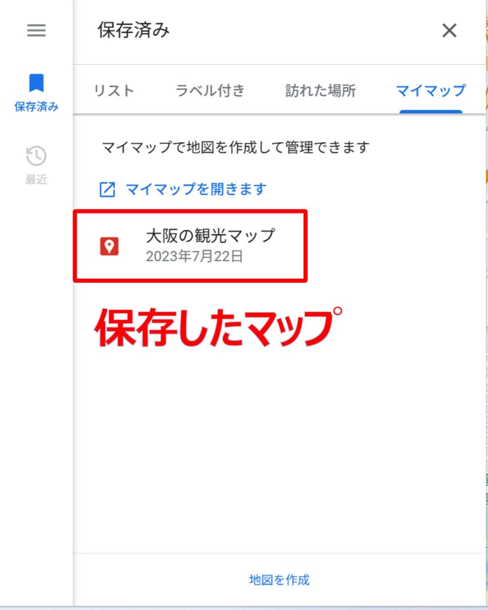 Googleマップのマイマップを一度閉じてから開き直すと、保存したマップ情報が残っていることを確認することが出来ます。