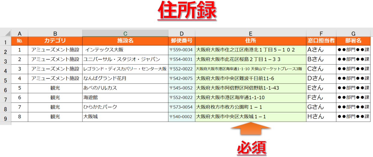 1つ目は、住所録の表の左端に不要な(無駄な)空白列を設定しないこと。