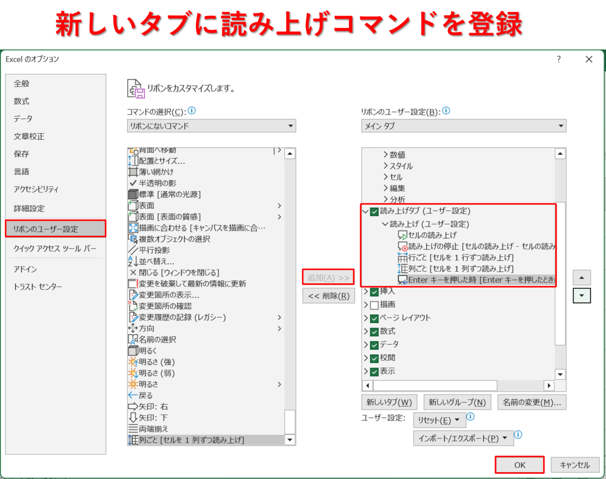 エクセルの「ホーム」タブや「表示」タブではなく、自分だけの「新しいタブ」に音声読み上げコマンドを登録することもできます。