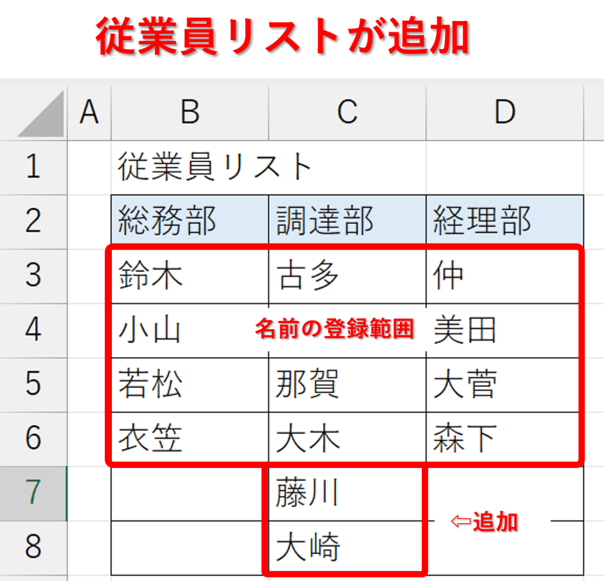 下の表のように、「調達部」に「藤川」「大崎」が追加になった場合の操作方法を紹介します。