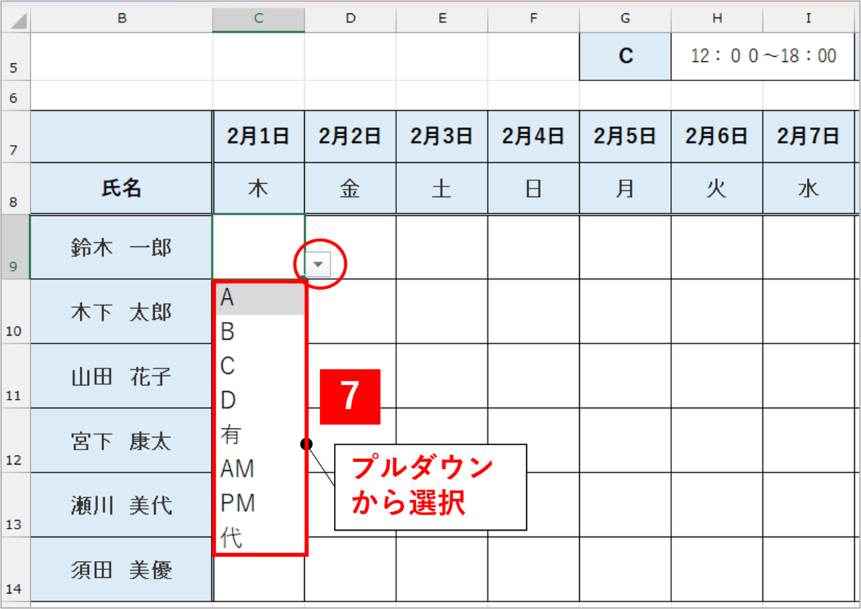 勤務時間ごとに【A】【B】【C】などに区分けして、プルダウンリスト(ドロップダウン)から選択できるようにします。