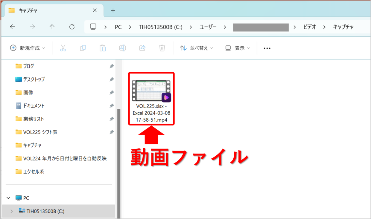 エクスプローラーを開き、「Cドライブ」⇒「ユーザー」⇒「ユーザー名」⇒「ビデオ」⇒「キャプチャ」に移動することで、動画ファイルが保管されていることを確認できます。