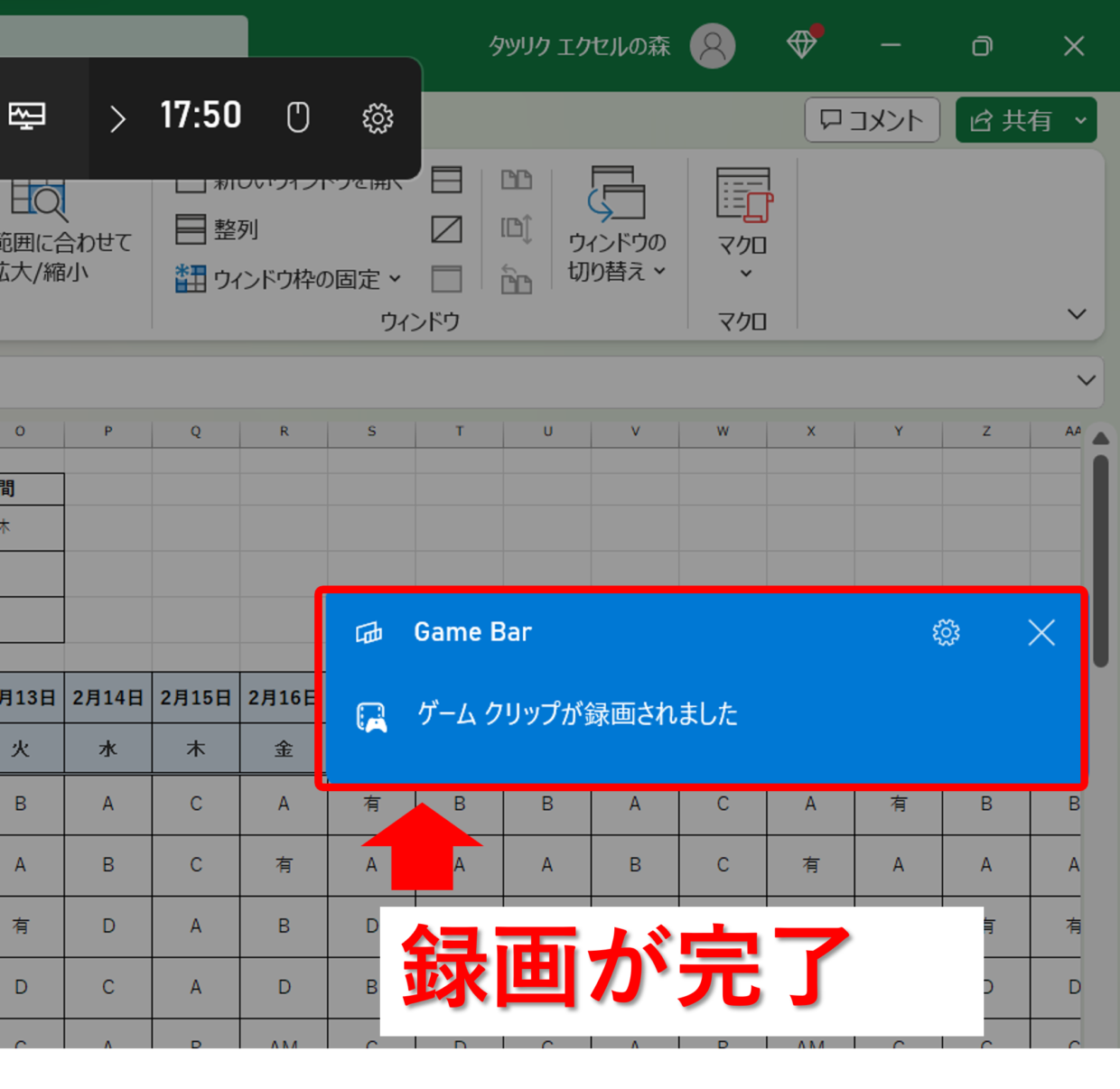 終了すると、画面の右側付近に「ゲームクリップが録画されました」とポップアップが表示されます。