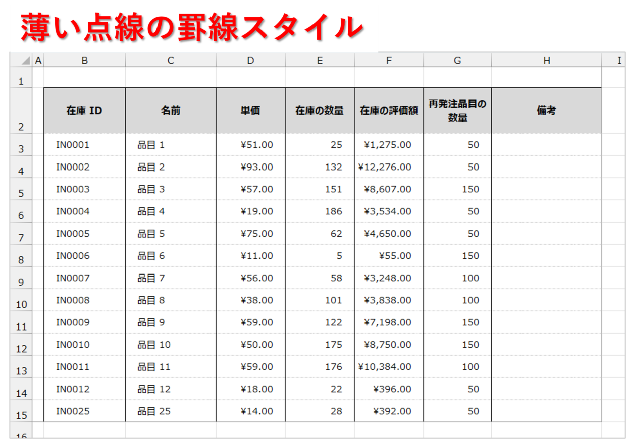 そうすると、H列のセルとI列のセルの境目の罫線が、薄い点線で表示されています。