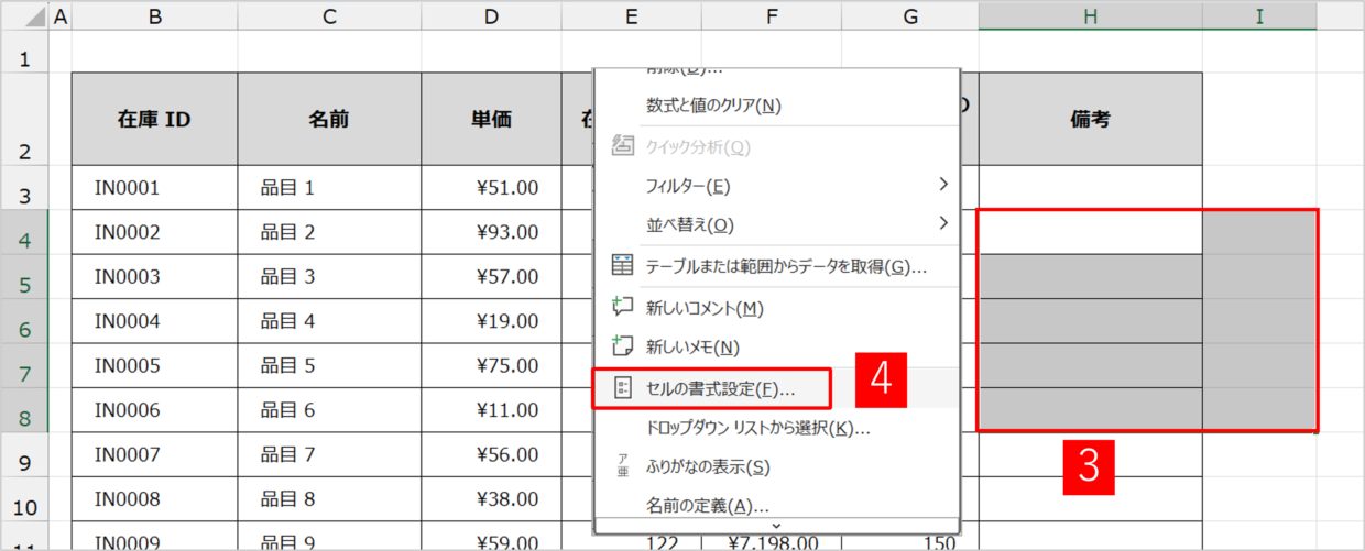 今度は、対象のセル範囲をH4セル~I8セルに広げて選択し、右クリックメニューの「セルの書式設定」をクリックして、罫線を確認してみます。