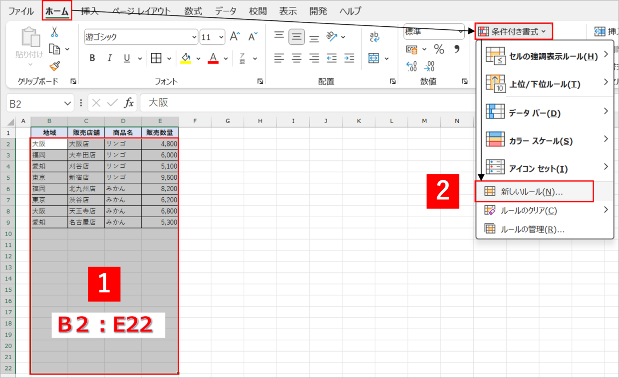 次に、「ホーム」タブの「条件付き書式」コマンドの「新しいルール」を選択します。(図2)