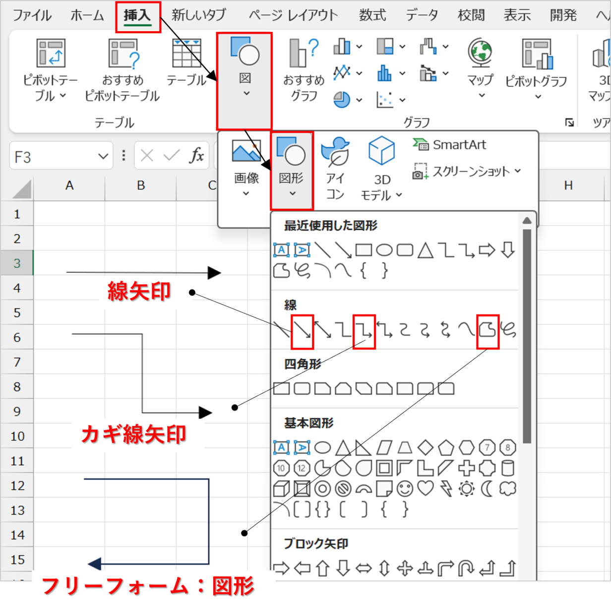 線の種類は、「線矢印」「カギ線矢印」「フリーフォーム:図形」の3種類を使います。