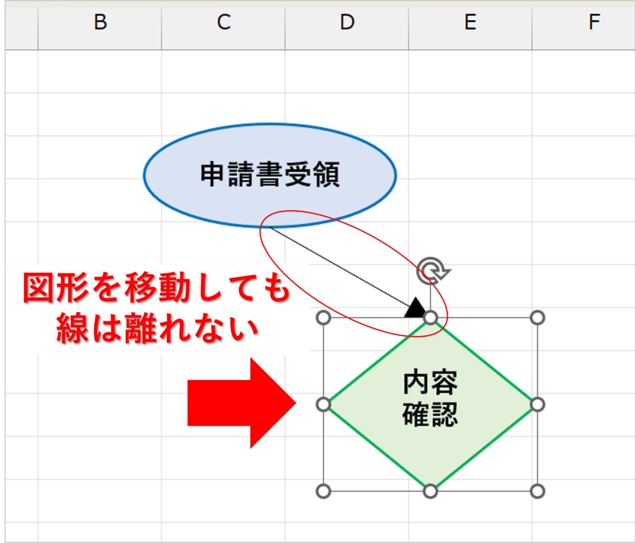 この状態で図形を移動しても、線と図形は離れず結合を保ってくれます。フローチャートを作成すると、図形の位置を変更することが多くなるので、結合は必ず行うようにしましょう。