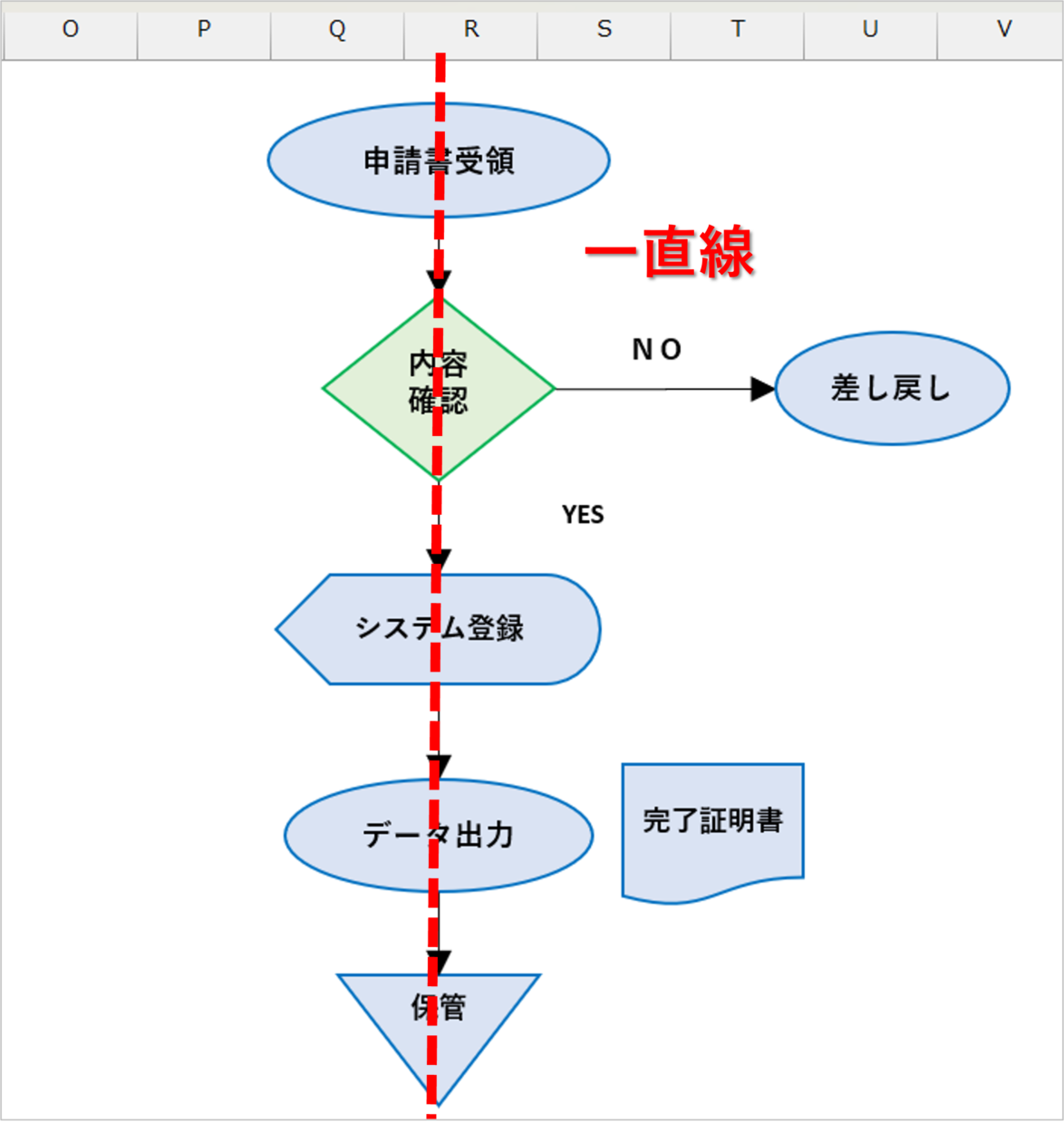 フローチャートの記号が上下に一直線にならずバラバラになってしまう場合は、エクセルの機能を使うことで一括でキレイに図形を並べることができます。