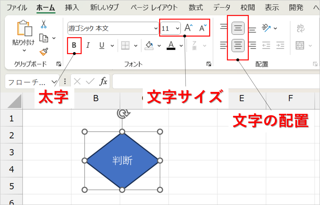 また、「ホーム」タブの「太字」ボタンや「フォントサイズ」ボタン、「配置」ボタンを使って、図形の中の文字の見栄えを調整します。
