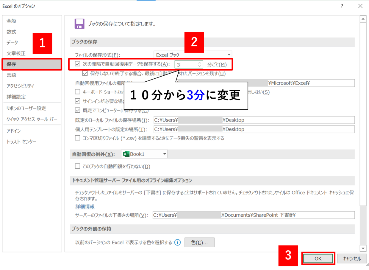1分間隔などあまり細かく設定すると自動保存されている間に予期せぬ問題が発生しないとも限らないので3分をお薦めします。