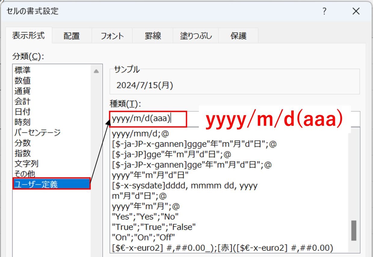 「7月15日(月)」と曜日を表示したい場合は、「セルの書式設定」画面の「表示形式」タブから分類:「ユーザー定義」に「yyyy/m/d(aaa)」と入力します。