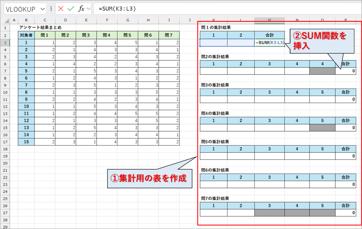 また、設問ごとにアンケートした人数が合っているか確認できるようSUM関数を挿入します。