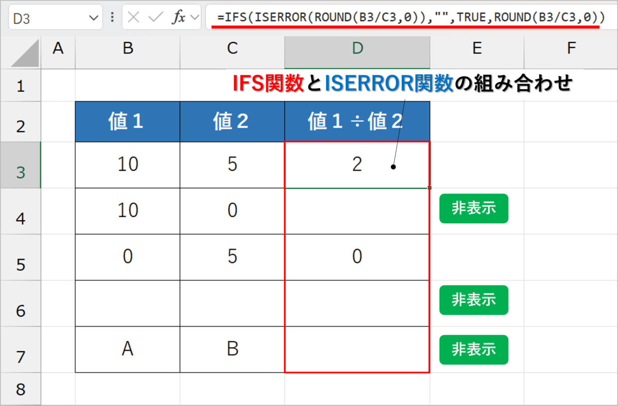 IFS関数とISERROR関数を組み合わせることで、エラー値を非表示にすることもできます。