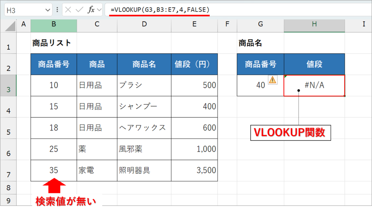 例えば、下の表はH3セルにVLOOKUP関数を挿入していますが、検索値「40」がB列に存在しないためエラー値が発生しています。