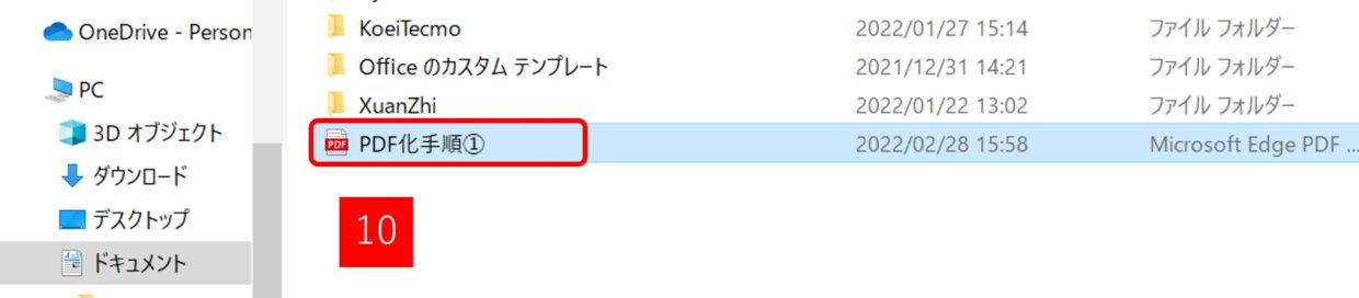 下の図のように、指定した保存場所にPDFファイルも保存されているので、再度保存し直す必要はありません。