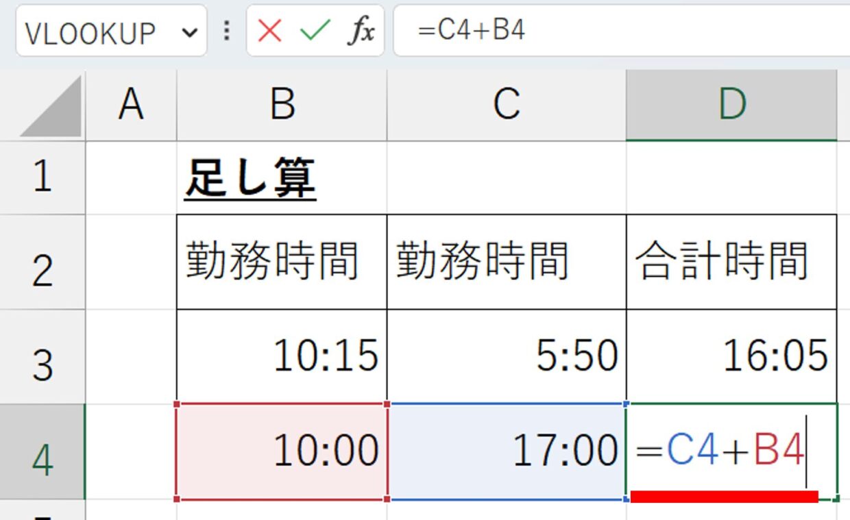 時間が入力されたセルを参照せずに時間の足し算を行うことも可能です。