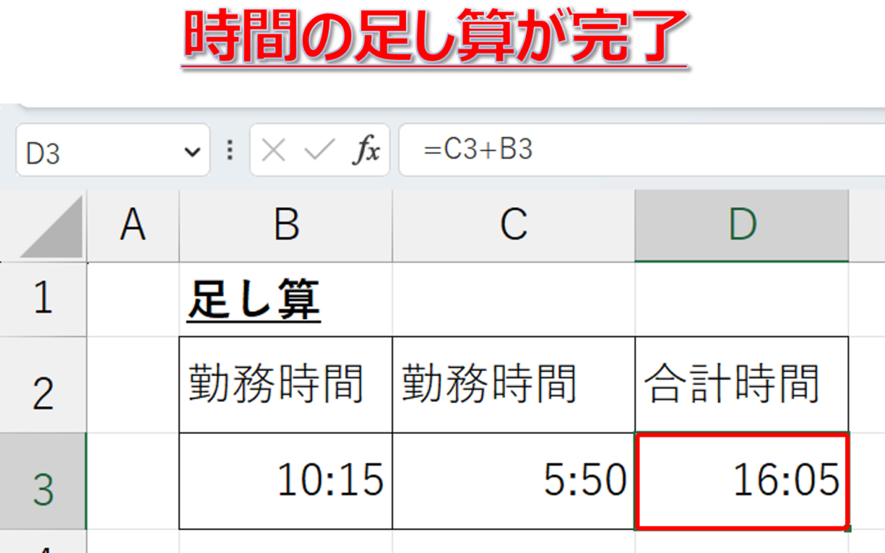 時間や時刻の足し算も、演算記号「+」を使うことで以下のように足し算することが出来ます。