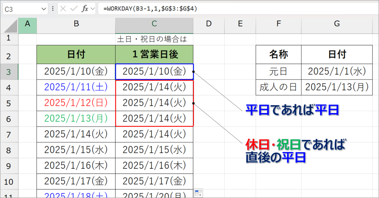 第1引数は指定した日付に-1を減算し、第2引数は「1」と指定します。祝日も休日と同じように扱いたい場合は、第3引数に祝日が入力したセル範囲(G3:G4)を指定します。