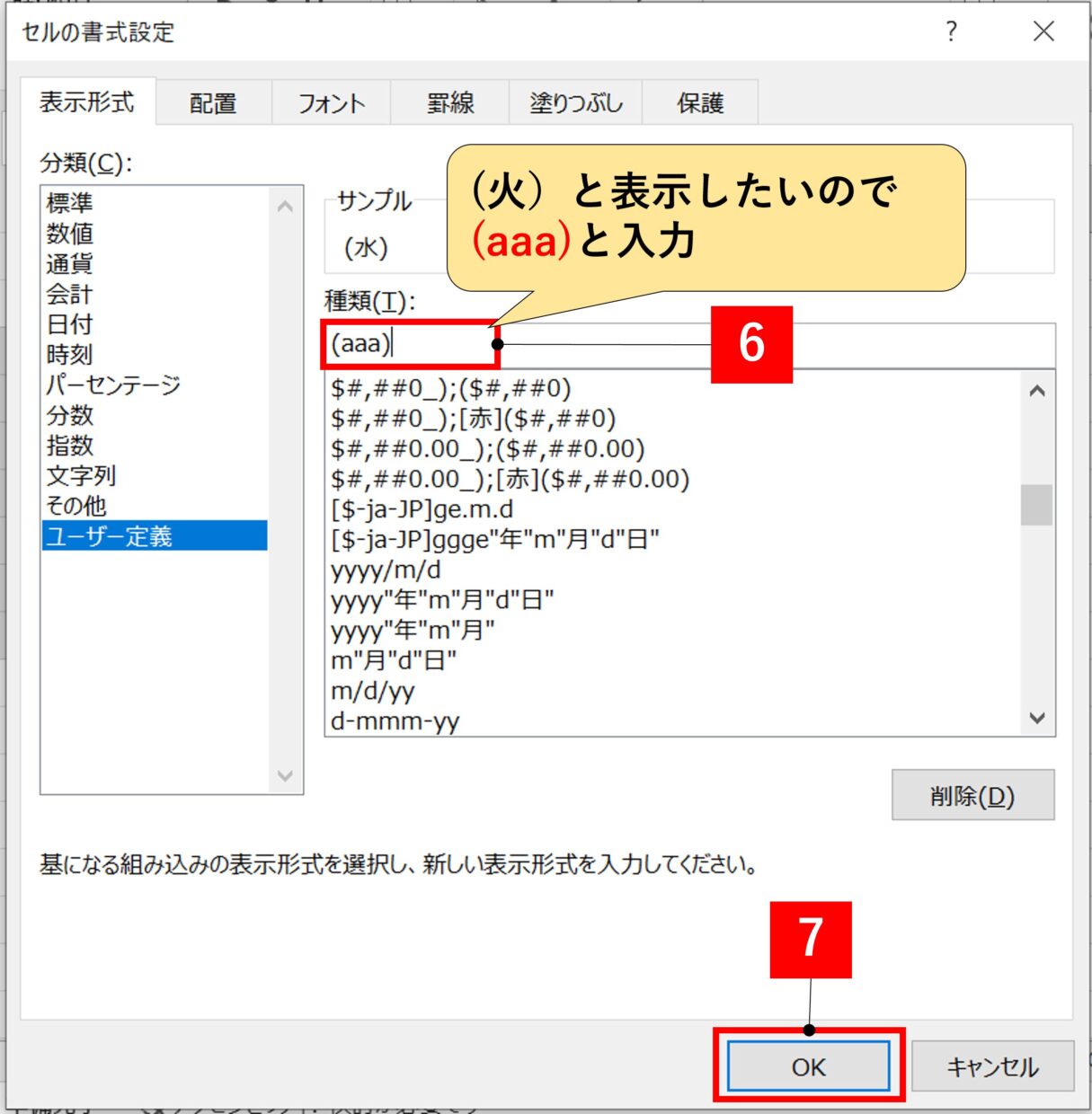 (火)のように表示したい場合の「ユーザー定義」は「(aaa)」なので、下の図のように「種類」の下の入力欄に「(aaa)」を入力します。設定が完了したら「OK」を押してください。