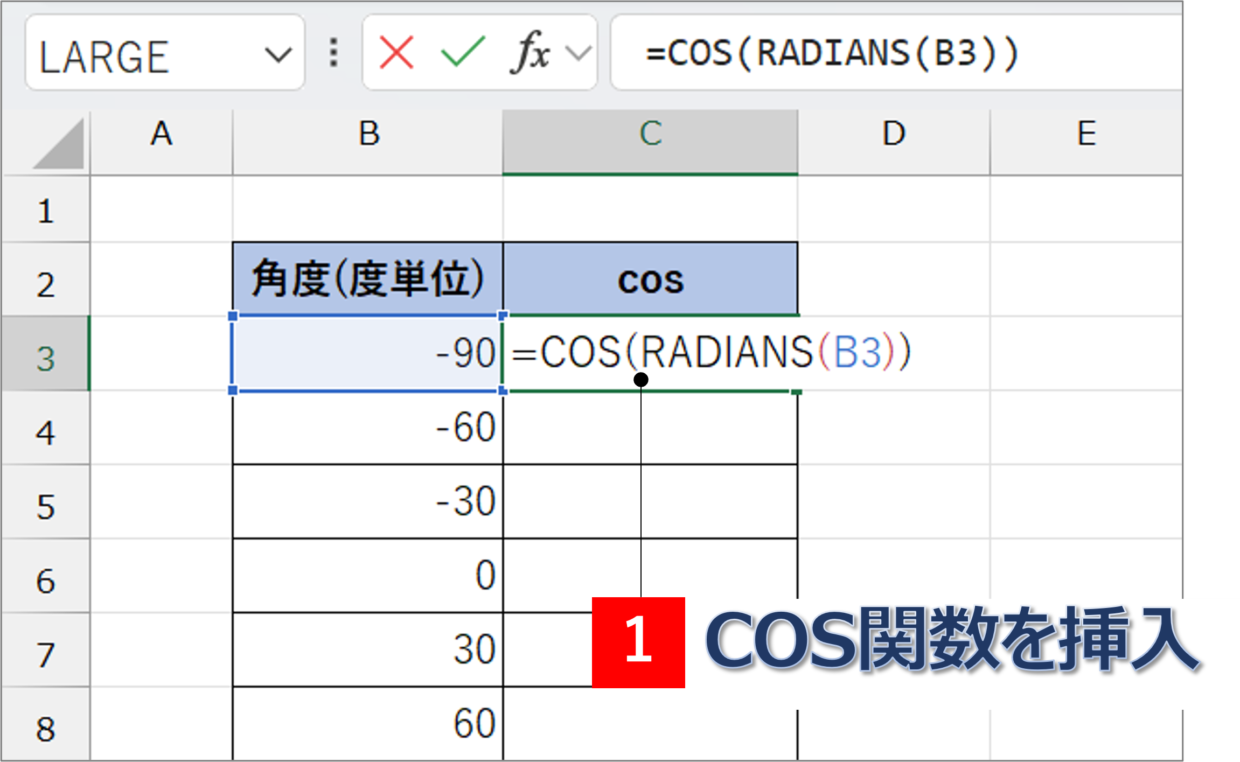 度単位からサインを求めるのであれば、COS関数の引数にRADIANS関数を挿入します。(例:=COS(RADIANS(B3))